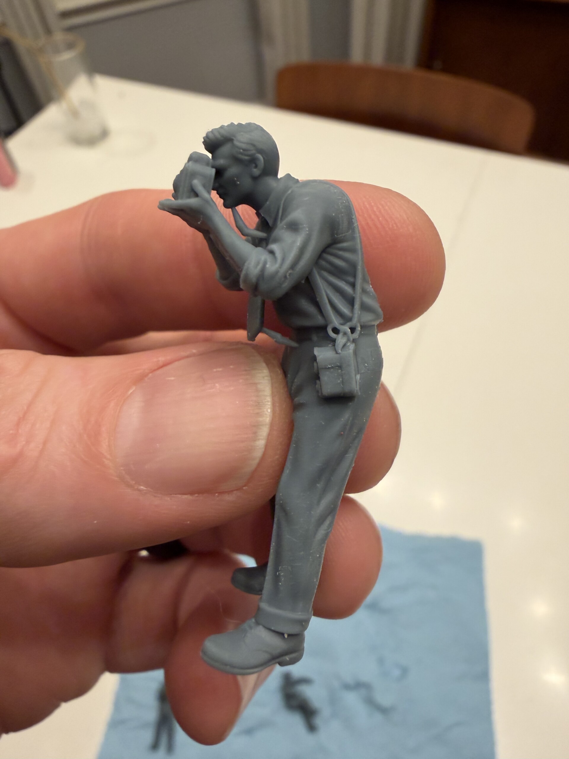 Use your spares box. Rather than trying to get every detail perfect in the 3D model — the right canteen, the exact weapon, the specific equipment — print the figure cleanly and add injection-molded details from your parts collection afterward.