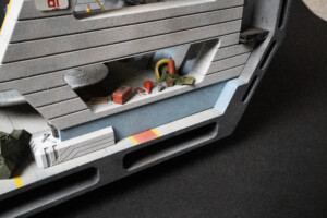 Once everything was glued, textured, primed and ready for paint, the mass volume of Tamiya paint usage began. This things big and sucked up paint like mad. Especially since I had to spray and spray again to adjust tones to get them where I wanted. White(ish) vertical walls, tan gray interior wall and deck color, Tamiya German Grey sides, blueish grey exterior colors as well as dark gray base color under the exterior panels.
