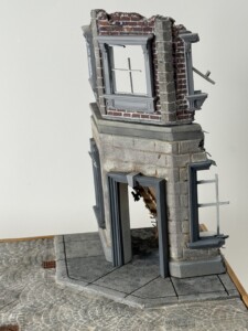 On top of the MDF I glued down two pieces of insulation foam, one cut to size for the sidewalk and building foundation, and one for the cobblestones. The cobblestone pattern was laser engraved (not cut all the way through, just cut about halfway down the piece of foam). This looked great on both counts and allowed me to weather, damage, and generally beat it up to look pretty realistic. You can see the first pass at the pieces of foam here: